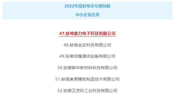 為積極響應(yīng)《蚌埠市智能工廠/數(shù)字化車間認(rèn)定管理辦法》《蚌埠市重大技術(shù)裝備首臺(tái)(套)認(rèn)定管理辦法》《蚌埠市工業(yè)設(shè)計(jì)中心認(rèn)定管理辦法》《蚌埠市綠色工廠評(píng)價(jià)管理暫行辦法》《蚌埠市服務(wù)型制造示范企業(yè)認(rèn)定管理辦法(試行)》等文件規(guī)定,經(jīng)我司積極申報(bào)申報(bào),縣區(qū)初審?fù)扑],相關(guān)部門審核,專家評(píng)審,征求意見(jiàn)以及公示等環(huán)節(jié)市經(jīng)濟(jì)和信息化局研究確定,蚌埠鼎力電子科技有限公司被認(rèn)定為2022年度蚌埠市“專精特新”中小企業(yè)。